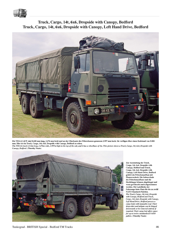 The TM truck range is a family of all-wheel-drive logistics trucks manufactured for the British Armed Forces by Bedford Vehicles in the final decade of the Cold War era. It contains the TM 4-4 fleet of 8-tonne and TM 6-6 fleet of 14-tonne payload-class vehicles. The range includes 4x4 and 6x6 cargo truck variants with or without a self-recovery winch, those with or without a Crane Attachment Lorry Mounted (CALM), a 4x4 tipper model and a couple of special-purpose models. From the time the vehicles entered service in the early 1980s, TM trucks provided the British Army’s main logistics transportation means in the first, second and third lines. During their service life, TM trucks saw operational service with the British Army worldwide. This publication shows the technology, the service life but first and foremost the variants of the TM truck family in many hitherto unpublished exercise photographs.