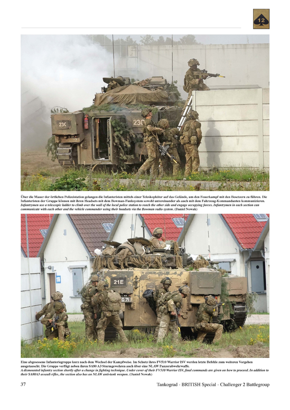 Three battlegroups can be formed from units of the 12th Armoured Brigade Combat Team. Two armoured infantry units with their headquarters company, two infantry companies (equipped with the Warrior ISV infantry fighting vehicle, and from 2025 with the Boxer MIV mechanised infantry vehicle), a fire support company (with anti-tank weapons and mortars) and a tank squadron (equipped with Challenger 2 MBT main battle tanks, from 2027 with the Challenger 3) can be structured as required. An even heavier battlegroup is also conceivable, consisting of two tank squadrons and an armoured infantry company. The exact composition always depends on the mission, and it can vary depending on the availability of resources. In addition, other combat support forces such as elements of the Royal Engineers or Royal Artillery can be requested and integrated.