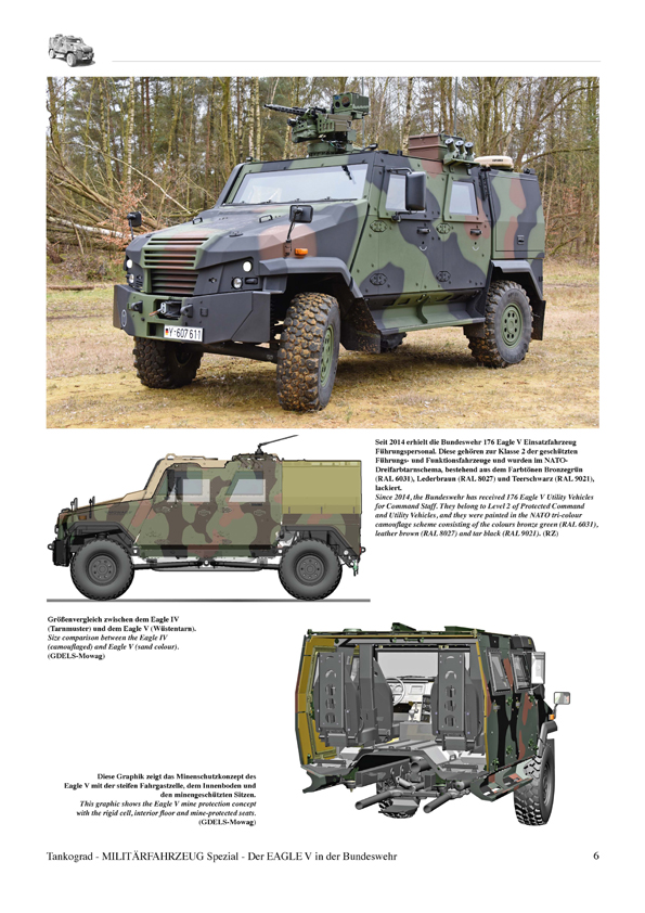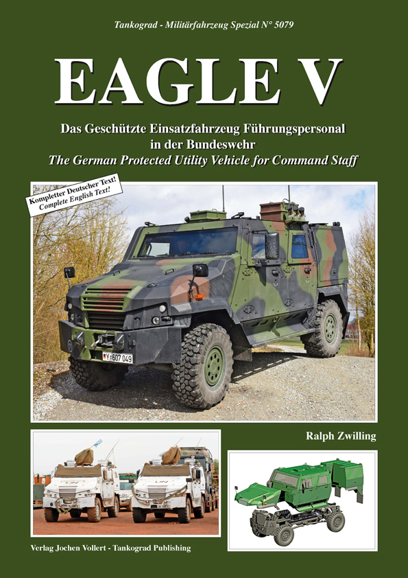 In the case of the new Eagle V Protected Utility Vehicle for Command Staff the focus of development was mainly on increasing the payload, improved protection of all areas, better mobility, logistical similarity to the already fielded Eagle IV, and quick availability. Since the first series vehicle had been handed over to the German Army on 04 April 2014, 176 vehicles have been procured by the Bundeswehr. This publication describes extensively the Eagle V in service, on exercises and missions abroad and shows its technical features in great detail.
