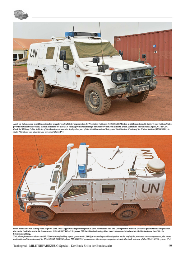 The aim of the Protected Command and Multipurpose Vehicles (Geschützte Führungs- und Funktionsfahrzeuge, or GFF) project is to optimally meet the armed forces' need for different protected platforms for operations, and to replace outdated unprotected vehicles. The Enok 5.4 used today by the German Army is part of the newly developed Light Armoured Patrol Vehicle 5.4 (LAPV 5.4) generation, and is a further development of the Mercedes-Benz G-model Wolf with special protection equipment (Sonderschutzausstattung). This publication describes the development history, the technology and the military service of the Enok variants