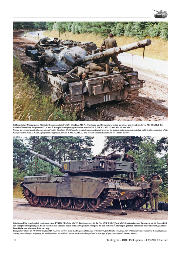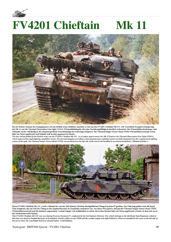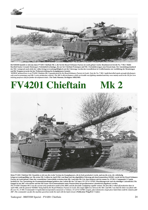 The FV4201 Chieftain was the first purposely designed main battle tank (MBT) of the British Army, and the main weapon system of the Royal Armoured Corps for most of the Cold War era. When it entered service in the 1960s it replaced the medium and heavy gun tanks in service with the British Army at that time, namely the FV4007 Centurion and FV214 Conqueror. The Chieftain was designed to dominate the battlefields of Western Europe if the Cold War ever turned hot, plus it was engineered to be superior to Soviet tank designs. In total, the British Army eventually received 941 FV4201 Chieftain MBTs. This publication describes meticulously and in great detail the various variants (Marks) of the Chieftain as well as the tank's development and technology. For this purpose it almost exclusively uses hitherto unpublished photographs taken on various exercises.