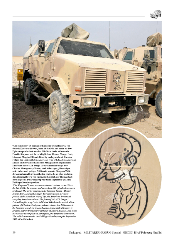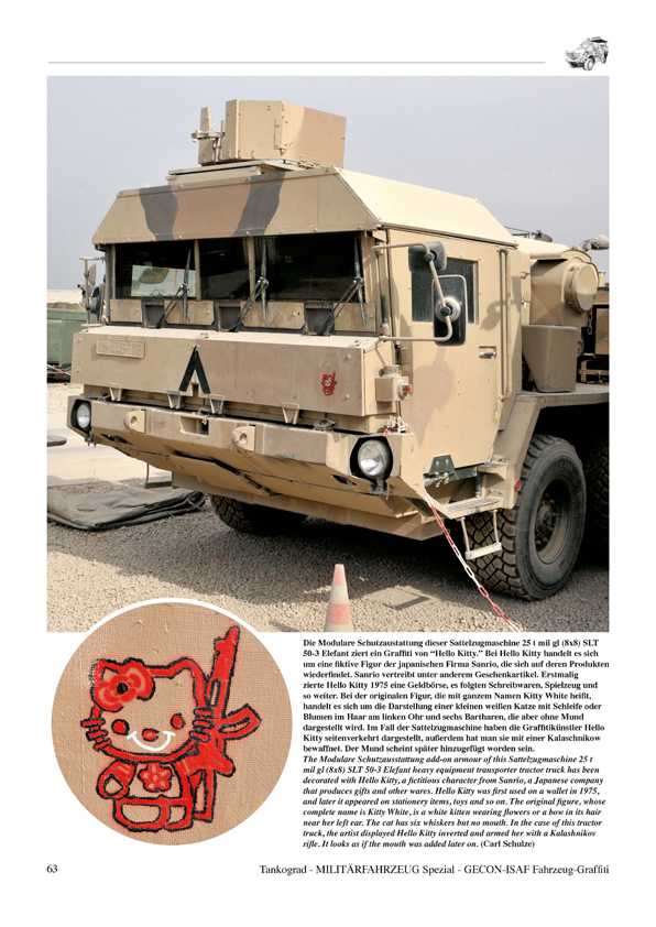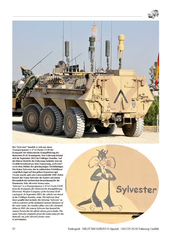 During the time of the Cold War they were exotic exceptions and generally not permitted on a wider scale. Yet today personalised vehicle markings gain more and more ground on vehicles of the modern German Army. From cool nicknames to names of famous TV characters and even comicbook superheroes these ‘graffiti’ convert a piece of wheels and metal into an accepted part of the troop, into the steel comrade of the soldiers. This publication is the first ever to deal with the personalised non-regular markings on German military vehicles during the ISAF mission in Afghanistan.