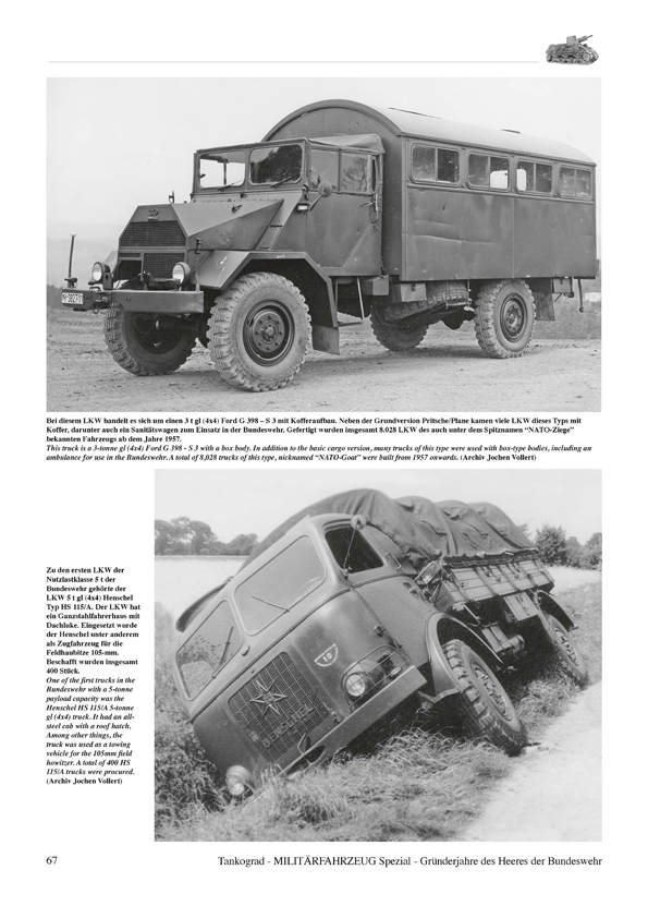 Based on the increasing tensions of the Cold War, West Germany became the centre stage of a potential third world war battlefield in Europe. Only ten years after the German Wehrmacht’s defeat in World War Two it was seen as crucial to create a modern German Army, the Bundeswehr. The rearmament of the Heer ground forces in the founding years of the Bundeswehr in 1956-65 can be described as “American armour and German trucks“. This publication provides rare, eye-candy and mostly hitherto unpublished photographs of the first decade of modern German military vehicles including armoured legends such as the American-made M4 HST, M5A4 HST, M7, M16, M39, M41, M42, M44, M47, M48, M55, M74, M88, M113 and legendary trucks by German manufacturers such as Borgward, Mercedes-Benz, Daimler-Benz, Faun, Porsche, Auto-Union/DKW, Henschel, Magirus-Deutz, MAN as well as many other unique vehicle types.