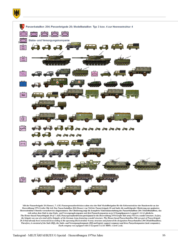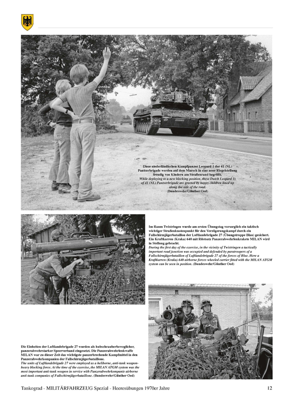 "Battlefield Germany": The three corps of the German Army had a key role in NATO's defence plan for West Germany during the time of the Cold War. Missions of the different corps focused on possible main points of entry that might be used by well-equipped tank armies of the Warsaw Pact: I. (GE) Corps was responsible for the north German plain, III. (GE) Corps for the Fulda Gap and II. (GE) Corps for the low and high mountain ranges of southern Germany. In the 1970s, in turn each of the German corps conducted a Heeresübung full-force field training exercise (FTX) with participating Allied units from the US, UK, Canada and the Netherlands. This is the story of three of these major FTXs and the military vehicles involved.