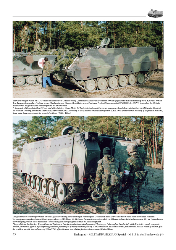 No other vehicle in the history of modern armoured vehicles has been nearly as successful as the American M113 armoured personnel carrier (APC). The Heer (Army) of the German Bundeswehr also procured this successful vehicle from 1962 onwards, fielding it under the name Mannschaftstransportwagen (MTW) M 113. In the Cold War period, some 4,000 M 113s and variants belonged to the vehicle inventory of the German Army, among them many specialised variants. During their service with the German Bundeswehr, vehicles of the M 113 family were also put through several programmes aimed at improving their combat capabilities and extending their in-service life.