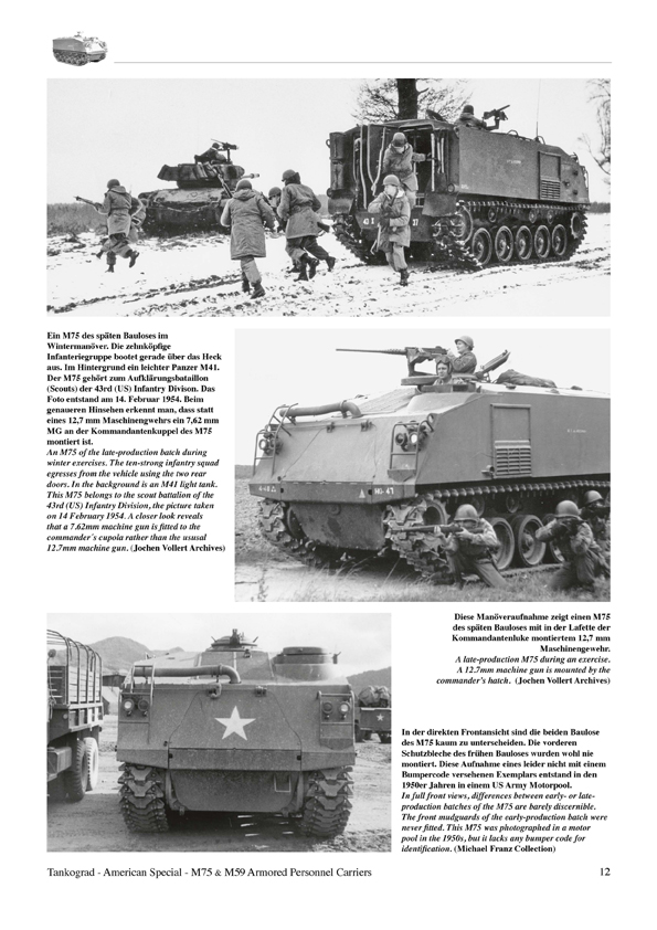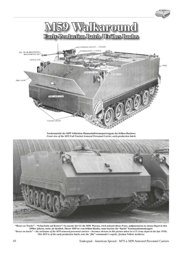 This publication tells for the very first time as a monograph the story of the M75 and M59 armored personnel carriers (nicknamed "boxes on tracks" due to their appearance) with exercise photos in service with the US Army and with lavishly illustrated technical walkarounds.