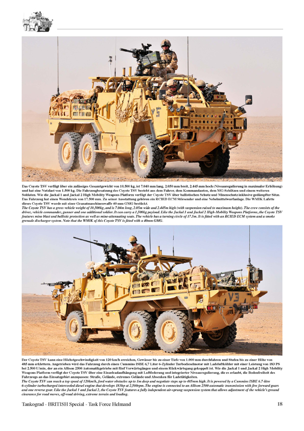 For the first time this publication shows the full range of vehicles fielded by Task Force Helmand in 2011 including many, that were only recently specially procured for the Afghanistan deployment. Apart from protected patrol vehicles, armoured reconnaissance vehicles and armoured infantry fighting vehicles, the numerous pictures and detailed texts also present logistic vehicles, engineer equipment, artillery systems and helicopters.