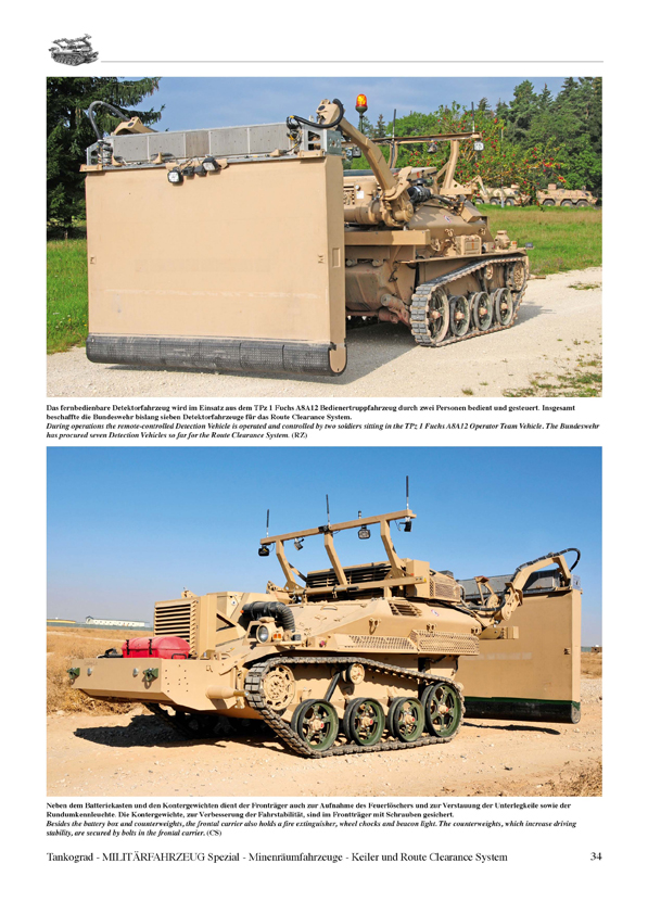 The most modern mine-clearing system of the Bundeswehr is the German Route Clearance System consisting of a TPz 1 Fuchs A8A12 protected Operator Team Vehicle, two remote-controlled elements, the Detection Vehicle based on the Wiesel 1 and the Manipulator Vehicle Mini MineWolf MW240, plus support vehicles.