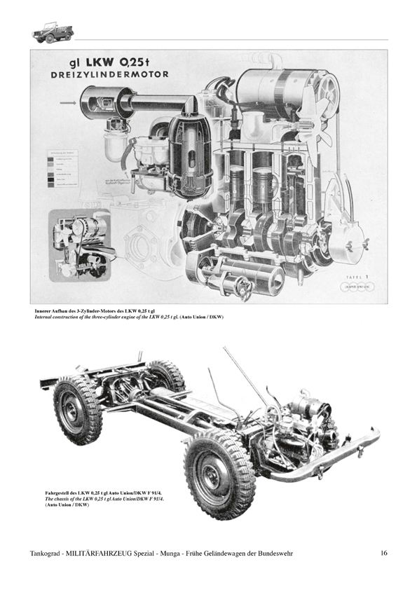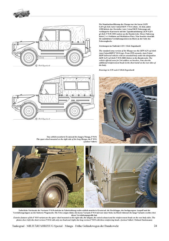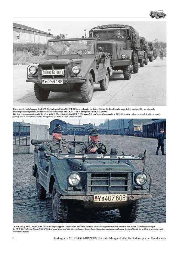 In 1954 West Germany began to implement its plans to raise new German armed forces. After technical trials and extensive troop trials, the decision to procure the light all-terrain vehicle offered by Auto Union/DKW was made in the spring of 1956. Series production of this LKW 0,25 t gl (4x4) Auto Union/DKW F 91/4-900 Munga began in October 1956. From 1958 onwards the more powerful F 91/4-1000 Munga and the longer F 91/8-1000 Munga were introduced.