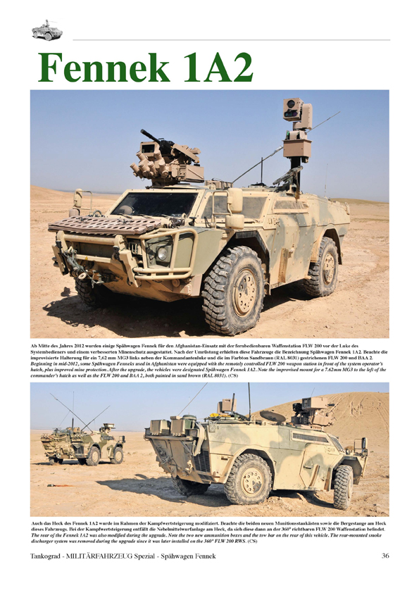 As the German Bundeswehr reconnaissance troops' Luchs reconnaissance vehicle became obsolete it was high time to develop and procure a completely new armoured wheeled reconnaissance vehicle. Delivery of the first Fennek Reconnaissance Vehicle to the Bundeswehr at the German Armour School in Munster on 10 December 2003 can therefore be viewed as a milestone in the procurement of equipment for the Aufklärungstruppe. The first-production-lot vehicles included 178 Reconnaissance Vehicles as well as 24 Engineer Command and Reconnaissance Vehicles. An additional 4 Fennek Artillery Observer Vehicles were ordered as an urgent operational requirement, but later rebuilt. In parallel, the artillery developed two more Joint Fire Support Team (JFST) Fennek versions, of which 20 examples were fielded. Altogether, the Bundeswehr procured 226 Fenneks, some of which have since been destroyed during operations. This publication comprehensively describes the development and technology of the Fennek in all its variants.
