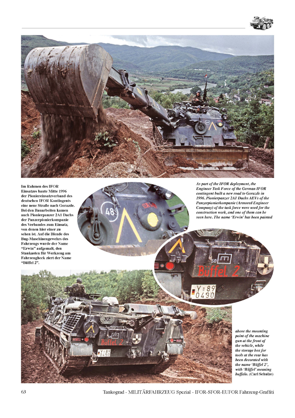 Zu Zeiten des Kalten Krieges noch Ausnahme-Erscheinungen, gewinnen personalisierte Fahrzeugmarkierungen in der Bundeswehr immer mehr Raum. Von coolen Spitznamen über TV-Charaktere bis hin zu Comic-Superhelden machen diese “Graffiti“ das anonyme Militärfahrzeug zu einem Teil des Trupps, zum stählernen Kameraden der Soldaten. Vorliegende Publikation geht erstmalig detailliert auf diese nicht-offiziellen Markierungen an Fahrzeugen der Bundeswehr in den IFOR, SFOR und EUFOR Einsätzen auf dem Balkan ein.