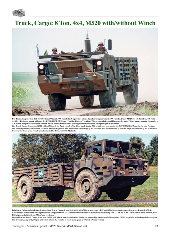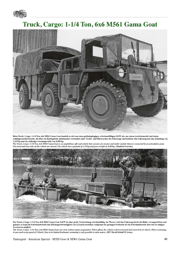 In den 1950er Jahren begann man in den USA damit, hochgeländegängige Lastkraftwagen für den Armeeinsatz zu konzipieren. Die beiden herausragensten Erfolge dieser Bemühungen waren ab 1966 die M520 Goer und ab 1969 die M561 Gama Goat Knickgelenk-LKW. Mit ihrer Geländegängigkeit waren beide Entwürfe Meilensteine des militärischen LKW-Baus und auf den mit ihnen gewonnen Erfahrungen bauen noch heutige Entwürfe auf. Trotz ihrer Wichtigkeit lag die Geschichte und der Einsatz sowohl des Goer als auch des Gama Goat unverdienterweise bisher in Dunkeln. Diese Publikation wirft erstmals ausführlich Licht auf beide Entwürfe und beschreibt diese in Entwicklung, Technik und Manövereinsatz. Eine weitere wichtige Lücke der US Army Fahrzeuggeschichte wird hiermit geschlossen.