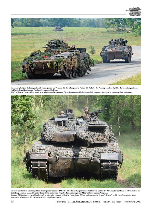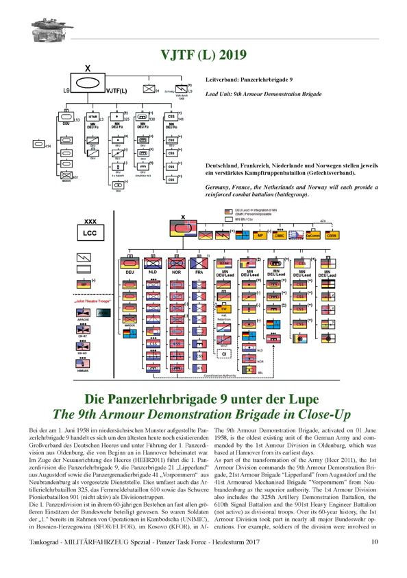 Mit rund 2.500 Soldatinnen und Soldaten sowie etwa 600 teilnehmenden Militärfahrzeugen übt die Panzerlehrbrigade 9 ihre zukünftige Rolle als Kern der Very High Readiness Joint Task Force (Land) VJTF (L). Besondere Highlights sind dabei die gefechtsmäßige Gewässerüberquerung der Aller und die Gefechtsphase auf dem Truppenübungsplatz Bergen. Das besondere Ereignis einen gepanzerten Großverband beim Üben fotografisch begleiten zu dürfen, ermöglichte vorliegende Publikation mit zahlreichen und besonders großformatigen Action-Fotos der Kampfpanzer, Schützenpanzer und Unterstützungsfahrzeuge und macht sie somit zum eindrucksvollen Zeugnis der Fähigkeiten des modernen Heeres der Bundeswehr.
