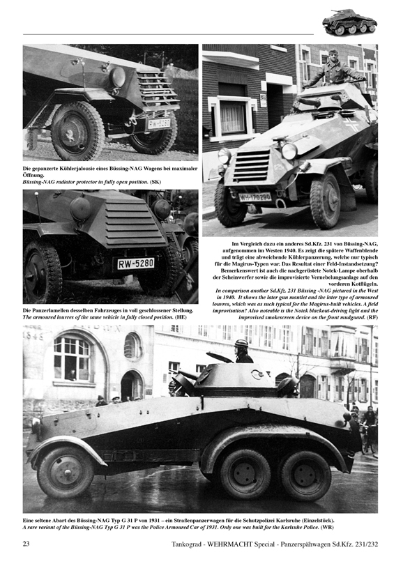 Kaum eine Radfahrzeugfamilie der Wehrmacht ist so bekannt wie die Sd.Kfz. 231/232 6-Rad/8-Rad Panzerspähwagen. Sie prägten das Bild der Blitzkriege entscheidend mit. Diese Publikation zeigt die gesamte Fahrzeugfamilie in Wort und Bild, ihre Geschichte, Technik und Varianten, in größtenteils bisher unveröffentlichtem Fotomaterial.