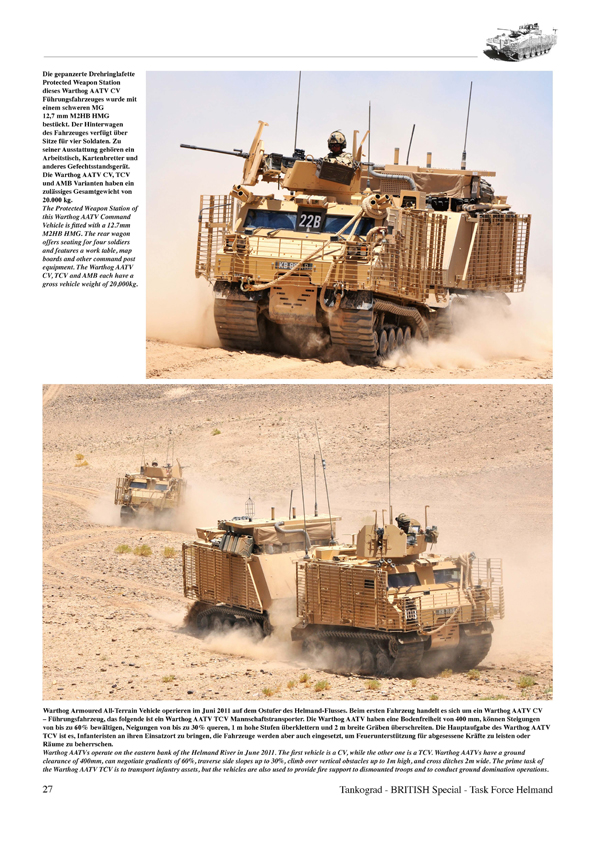 Diese Publikation zeigt erstmals die gesamte Palette der von der Task Force Helmand im Jahre 2011 eingesetzten Fahrzeuge, darunter viele, die speziell für den Einsatz in Afghanistan erst kürzlich beschafft wurden. Neben geschützten Patrouillenfahrzeugen, Späh- und Schützenpanzern werden auch Logistikfahrzeuge, Pioniergerät, Artilleriewaffensysteme und Hubschrauber mit zahlreichen Fotos und ausführlichen Beschreibungen vorgestellt.