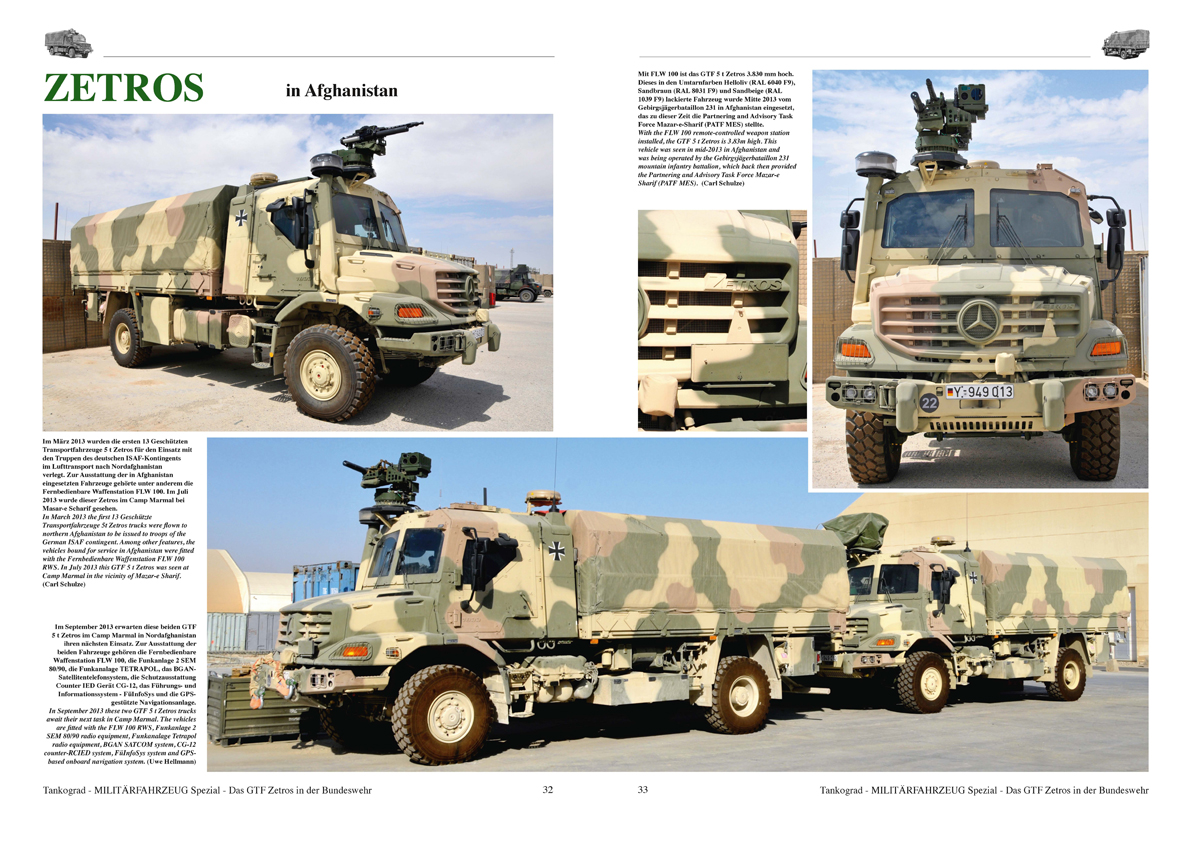 Das Geschützte Transportfahrzeug 5 t Zetros mit und ohne Seilwinde ist der erste LKW-Typ, der im Zuge des GTF-Programms der Bundeswehr beschafft wurde. Entwickelt und gefertigt von Mercedes Benz Special Trucks kann der allradgetriebene, extrem geländegängige und mit einem geschützten Fahrerhaus ausgestattete Hauben-Lastkraftwagen mit einer Fernbedienbaren Waffenstation FLW 100 bestückt werden und dient dem Transport von Stückgut, Tankanlagen und Kabinen. Die ersten GTF 5 t Zetros wurden 2012 der Truppe übergeben. Ab 2013 kamen sie auch mit dem deutschen ISAF-Kontingent in Afghanistan zum Einsatz. Mittlerweile befinden sich bei der Bundeswehr auch ungepanzerte Zetros 1833A 5 t hümS 4x4 im Einsatz, beide Fahrzeugtypen werden in vorliegender Publikation detailliert abgehandelt.