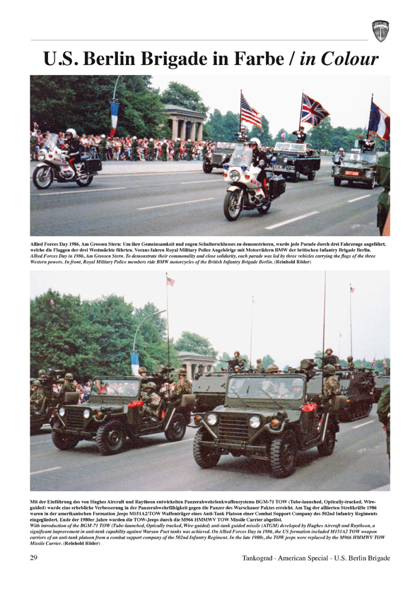With the arrival of the 2nd (US) Armored Division "Hell on Wheels" as a regular occupation force, the history of the U.S. Army began in Berlin in July 1945. In addition to the Soviet Union, United Kingdom and France, the American troops took over the administration of a sector of the city. In the following years Berlin would see historic events such as the Allied Airlift and the construction of the intra-German border, the "Wall". The U.S. Army, at first with the Berlin Military Post, then with the Berlin Command and finally with the Berlin Brigade, provided core support in defending the city against Soviet agitation, last but not least by providing a continued deterrent most visible by the presence of tanks. This publication shows, with many hitherto unpublished photos, the vehicles used by the U.S. forces in Berlin from 1950-94 - predominantly the tanks that kept the permanent Soviet threat at bay.