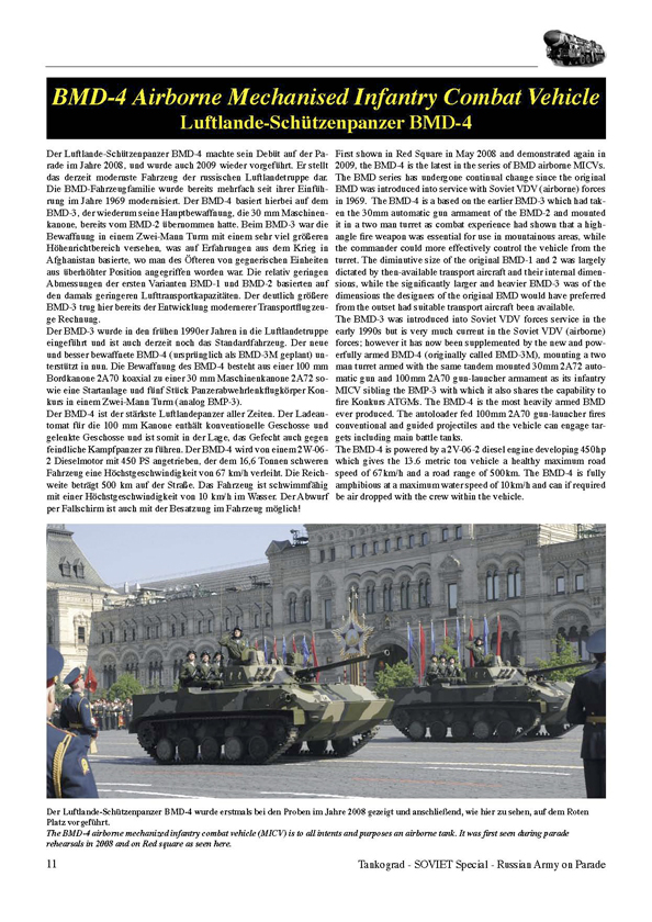 During the days of the Soviet Union, the annual military parades held on Red Square were for most foreign military observers the highlight of the year, the day when the Soviet Union's latest military technology was put on public display. After the Soviet Union broke up the parades were cancelled for nearly two decades. That all changed when in May 2008, tanks, armoured vehicles and rocket launchers returned to Red Square for Russia's first military parade of the 21st Century. This event was repeated in May 2009. This publication illustrates the vehicles shown on the 2008 and 2009 parades on the Red Square, thus granting a look on most recent Russian military vehicle technology.